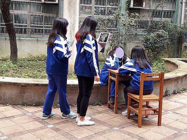 3. 這個教學活動剛好是在期末考完放寒假之前的幾天進行,所以學生對於不用坐在教室裡面上課、可以實際動手操作都顯得相當雀躍,有些組別還到處場勘,尋找合適的拍攝地點,有些組別則是大費周章準備道具,將教室的課桌椅搬到室外拍攝。看到學生認真拍攝,我心裡覺得他們對於自己在乎或感興趣的事物其實是相當投入的,而且也非常願意共同合作、一起學習,只是換個角度想,如何找到學生的學習興趣、如何激發他們的學習意願,真的就是老師們面臨的莫大挑戰了!
