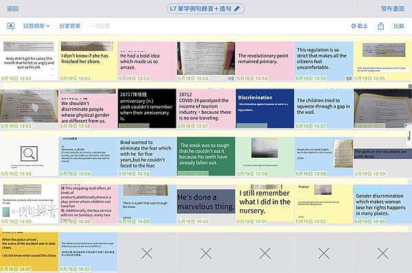 (2)第二天上課內容是講解單字,為了避免唱獨角戲,我時不時會抽點學生唸單字的例句,然後最後留下 10-15 分鐘指派給每位學生一個單字,請他們將該單字的例句錄音,並且使用單字造句。交來的作業(下圖是學生用 LoiLoNote School 完成錄音、造句)除了可以當作評量的依據,還可以順便了解學生是不是掛網。