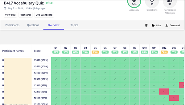 (4)第四天我用 Quizizz 出了 15 題單字題讓學生在線上小考,限時 8 分鐘。我請學生打開鏡頭,但是有學生使用桌機,沒有鏡頭,這是我原先沒想到的,算是上了一課。測驗一結束,老師馬上可以知道考試結果(如下圖),學生也可以利用平台的功能再自行訂正錯題。