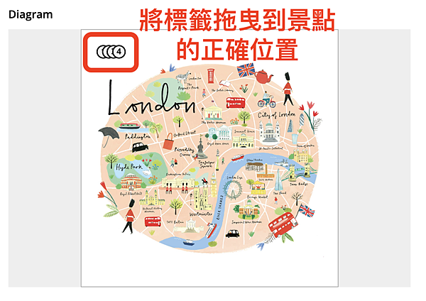 (4) 最後不要忘記將標籤拖曳到景點的正確位置。有幾個標籤內容,就會產生幾個標籤。每一個標籤都要放置在正確位置,有點類似設定標準答案,這樣系統在學生答題繳交之後,才能自動判別答案是否正確。